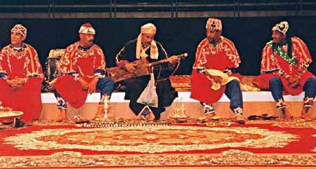 gesungenen Phrasen ab. Dabei sitzen die Gnawa in einer Reihe. Tänzerische